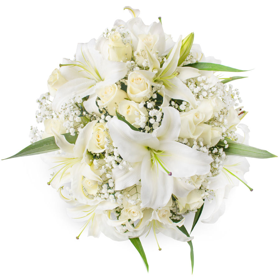 A classic floral composition including smooth white roses, liliums and gypsophila presented in a posy design. Full of beauty, grace and peace it is like from heaven.